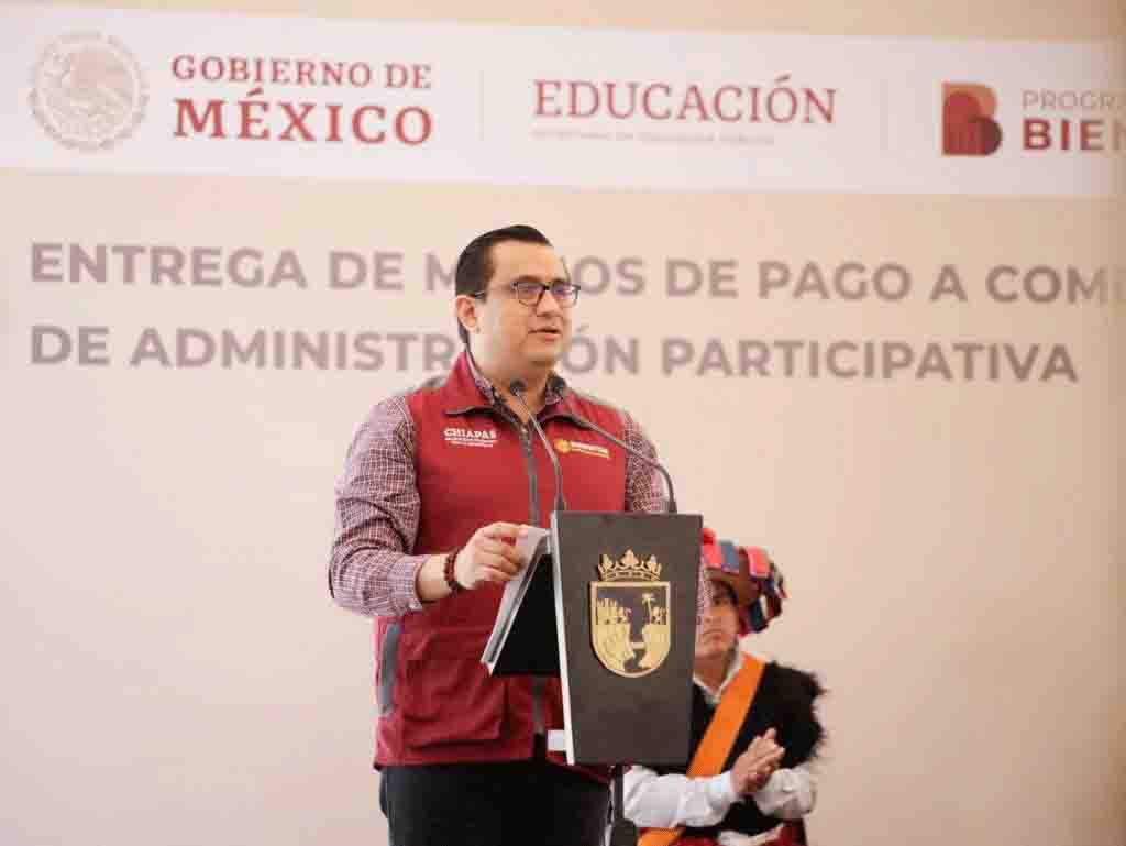 El delegado de Programas para el Bienestar, José Antonio Aguilar Castillejos; continúa encabezando la dispersión de los recursos que el programa La Escuela Es Nuestra destina a los Comités Escolares de Administración Participativa del territorio chiapaneco.