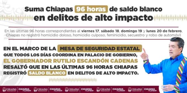 “En las últimas 96 horas correspondientes al viernes 17, sábado 18, domingo 19 y lunes 20 de febrero, Chiapas registró saldo blanco en delitos de alto impacto, como homicidio doloso, homicidio culposo, feminicidio, secuestro y robo de automóvil. Este resultado nos motiva a continuar redoblando esfuerzos para garantizar la paz y el orden en la entidad”, declaró el jefe del Ejecutivo estatal.